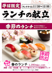 平日ランチ好評につき新メニューが登場です!季節のおすすめ握りと人気のネタが入った期間限定のお得な盛合せとなっております!ご来店お待ちしております。